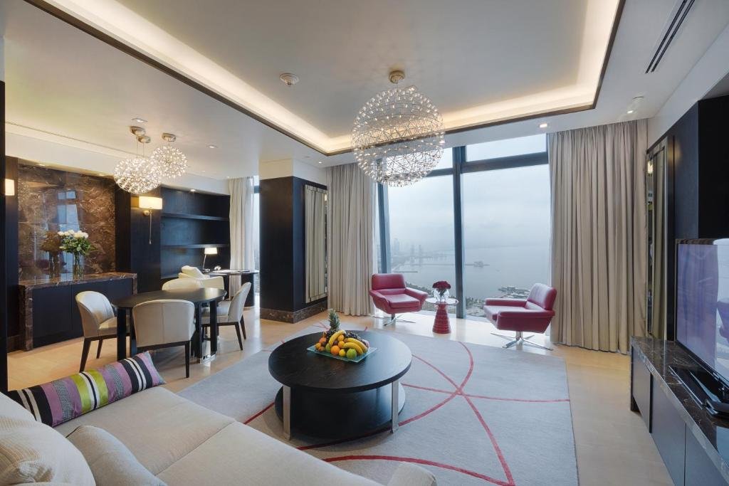 135 m² Sea view Pool with a view Rooftop pool Air conditioning Free WiFi! Free parking Room size 135 m² The Caspian Suite offers the best, breath-taking views of the Sea, from floor to ceiling, double floor (high ceiling) windows at the top of the Flame Tower. It is a perfect choice for those who requires additional living space. 120 m² wonderfully spacious suite features a private bedroom with a king size bed and luxurious on-suite, a kitchen area, living room, dining room and fully equipped work desk area, with separated guest bathroom. Elegant décor and contemporary style provides guests with exceptional luxury living at the top of the tallest building in Azerbaijan. Guests staying in this room have access to private check-in/check-out, complimentary breakfast, afternoon tea ceremony, early evening Hors D’oeuvres, local beverages and complimentary high-speed WiFi in the Fairmont Gold lounge located on the 19th floor. In your shared bathroom: Free toiletries Bathrobe Additional bathroom Bidet Toilet Bath or Shower Towels Linen Slippers Hairdryer Additional Toilet Towels/Sheets (extra fee) Toilet paper View: Sea view Room facilities: Upper floors accessible by elevator Hot Tub Sauna Wardrobe or closet Tea/Coffee Maker Minibar Air conditioning Safety Deposit Box Hypoallergenic Tile/Marble floor Soundproofing Ironing Facilities Iron Interconnected room(s) available Heating Carpeted Laptop safe Coffee machine Electric kettle Tumble dryer Toaster Dining table Sofa Desk Seating Area Dining area TV Telephone Satellite Channels Pay-per-view Channels Flat-screen TV Cable Channels Outdoor dining area Socket near the bed Clothes rack Drying rack for clothing Wake Up Service/Alarm Clock Wake-up service Executive Lounge Access Smoking: No smoking Parking: Free private parking is possible on site (reservation is not needed).
