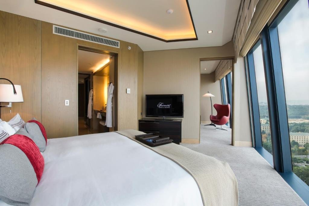70 m² City view Pool with a view Rooftop pool Air conditioning Free WiFi! Free parking Room size 70 m² Fairmont Gold Signature Suites are located at the corner of the Flame Towers building, providing a uniquely shaped room with chic, contemporary décor and spectacular view of the City of Baku. These spacious guest rooms feature 70 m² of living space, with private bedroom, separate living room with HD TV and a spacious work desk area. These suites come with one king bed and is non-smoking only. Guests staying in this room have access to private check-in/check-out, complimentary breakfast, afternoon tea ceremony, early evening Hors D’oeuvres, local beverages and complimentary high-speed WiFi in the Fairmont Gold lounge located on the 19th floor. In your shared bathroom: Free toiletries Bathrobe Bidet Toilet Bath or Shower Towels Linen Slippers Hairdryer Additional Toilet Towels/Sheets (extra fee) Toilet paper View: City view Room facilities: Upper floors accessible by elevator Hot Tub Sauna Wardrobe or closet Tea/Coffee Maker Minibar Air conditioning Safety Deposit Box Hypoallergenic Tile/Marble floor Soundproofing Ironing Facilities Iron Interconnected room(s) available Heating Carpeted Laptop safe Coffee machine Electric kettle Tumble dryer Dining table Desk Seating Area Dining area TV Telephone Satellite Channels Pay-per-view Channels Flat-screen TV Cable Channels Outdoor dining area Socket near the bed Clothes rack Drying rack for clothing Wake Up Service/Alarm Clock Wake-up service Executive Lounge Access Smoking: No smoking Parking: Free private parking is possible on site (reservation is not needed).